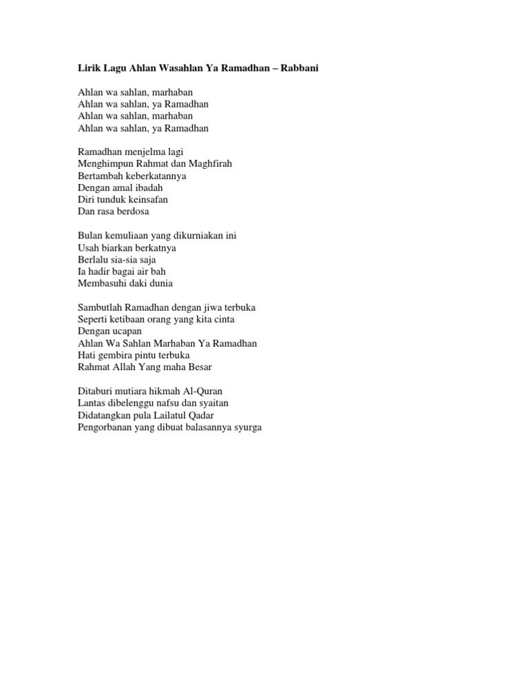 Lyrics for Ahlan Wasahlan Ya Ramadhan by Rabbani. Marhaban ya ramadhan مرحبا يارمضان adalah lagu yang dinyanyikan oleh mayadalagu ini terdapat pada. Lagu Marhaban Ya Ramadhan misalnya terkenal dan ada nih mp3.